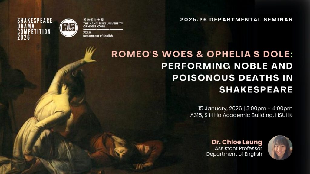 The Department of English cordially invites you to join our departmental seminar, Romeo’s Woes & Ophelia’s Dole: Performing Noble and Poisonous Deaths in Shakespeare, to be organised on 15 January 2026 (Thursday).